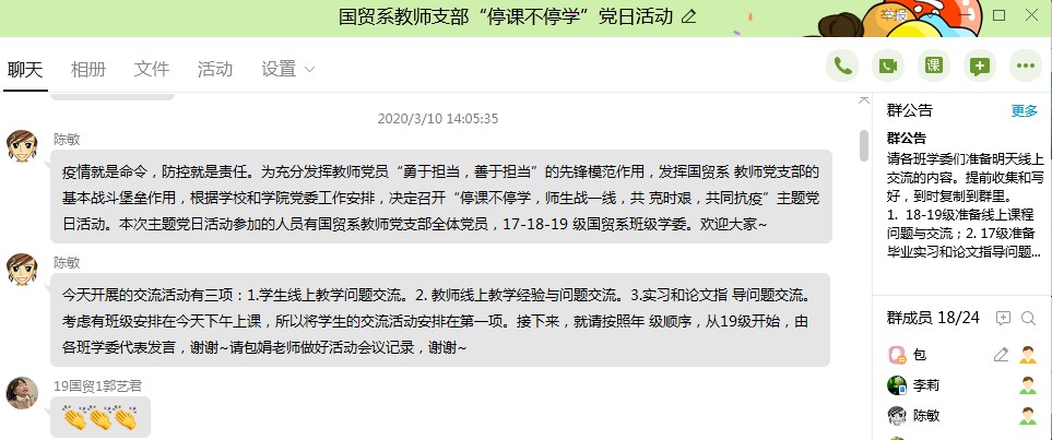 依托QQ群线上会议的形式开展“停课不停学,师生战一线,共克时艰,共同抗疫”主题党日活动。活动围绕学生线上教学问题、教师线上教学经验与问题、实习和论文指导问题等内容展开交流。要求全体教师党员要以“勇于担当,善于担当”的模范作用,带领全体师生困境中学榜样,学先进,站好每一班岗,在学院党委的领导下“携手共战疫”,听指挥,勇担当,必胜利!