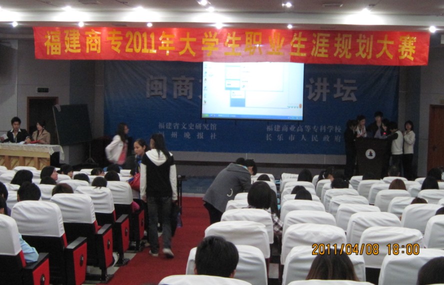 2011年4月8日18:00,由我校就业指导中心主办的福建商专2011年大学生职业生涯规划设计大赛在校演播厅拉开战火。本次大赛校领导给予了大力的支持:吴贵明副校长、黄跃舟副书记、张杰主任、张信容处长、林丹主任担任了本次大赛的评委。