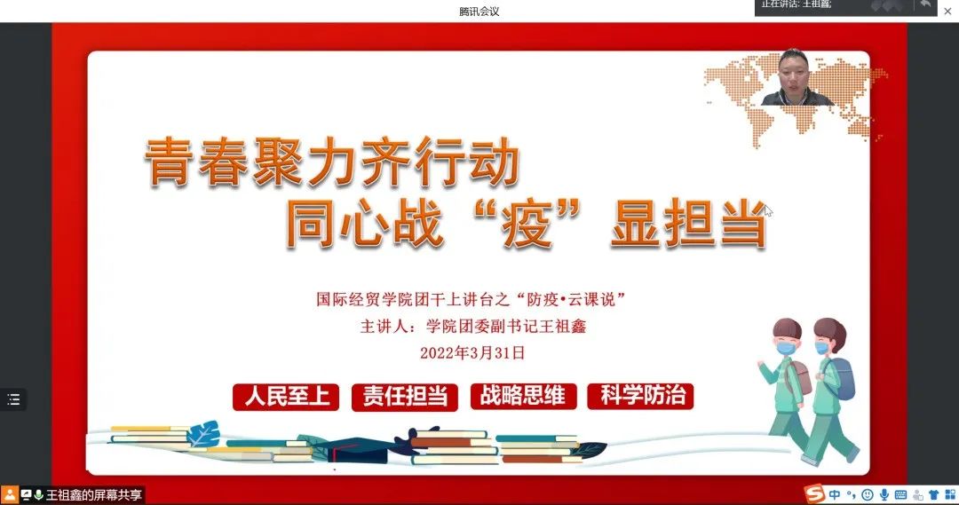 当前疫情防控形势复杂严峻,为积极响应校团委开展“请党放心‘疫’线有我”共青团抗击疫情专项行动,3月31日,yl7703永利集团团委组织开展“防疫•云课说”,通过线上会议的形式,讲好抗疫思政课。学院团委副书记王祖鑫老师主讲,团委干部及各团支部负责人参加。