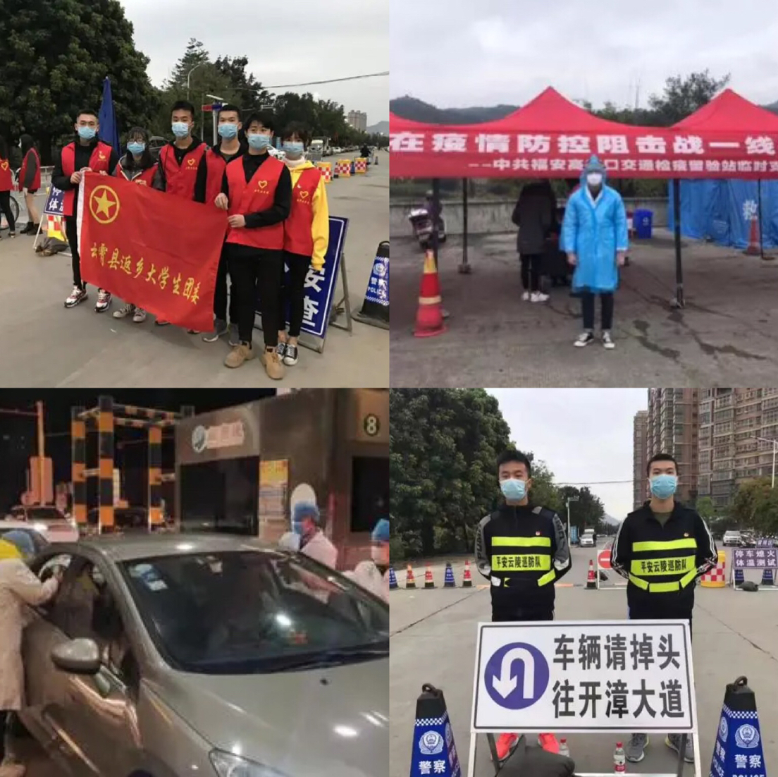 我院团员青年积极响应学院团委及各地团县委的倡议,13名学生主动报名参加当地的防疫志愿服务队,协助开展巡防、测量体温、维持秩序、宣传等相关工作。“疫情就是命令,行动彰显担当。我要忠于党,忠于人民!守初心、担使命,全力以赴,在党和人民需要的时候,我愿意挺身而出,投入到抗疫斗争中!”这是我院17级学生陈成锋申请加入福安市新型肺炎疫情防控志愿服务队时候的赤诚初心,作为团学干部,他率先垂范,勇于担当,主要负责在福安市高速路口交通检疫站负责相关工作,做到外防输入,内防扩散,守住关口,阻碍疫情扩散蔓延,对入城车辆逐一检查测量体温,做到严密排查,把好关口,对来往司乘人员等宣传防疫知识,同一切不利于疫情防控的言行做斗争,收获一致好评,用实际行动行新时代青年学子的使命担当,并有幸入选并刊登于福建省纪检微信公众号,在青年团员学生群体中起到了良好的模范示范作用。