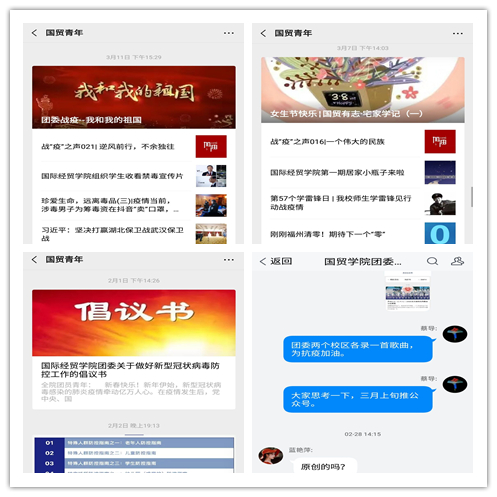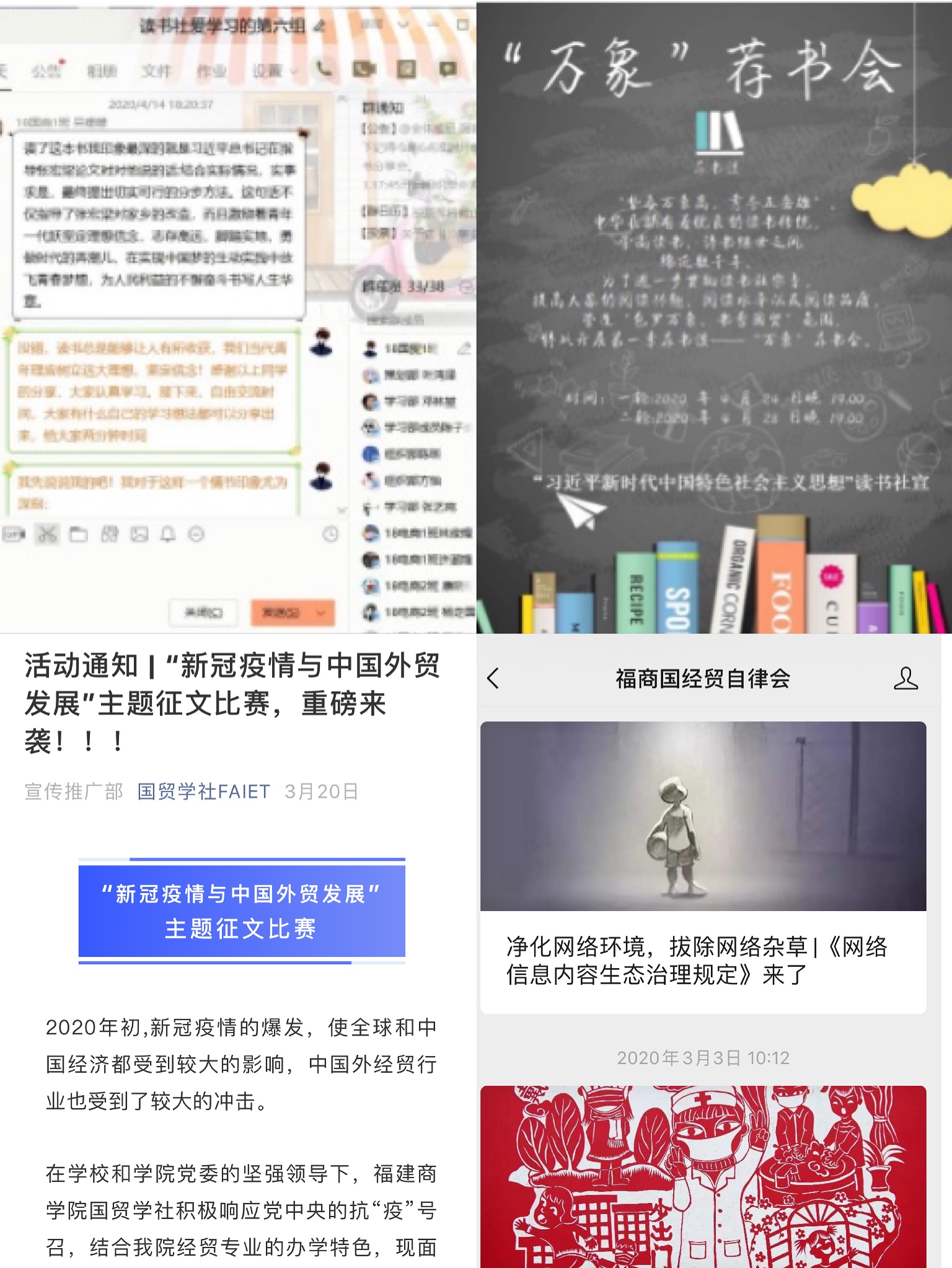 我院学生会、习近平新时代中国特色社会主义思想读书社、国贸学社、自律会等纷纷发挥组织力量,通过线上形式开展了主题丰富、形式多样的活动,不仅丰富了同学们的居家生活,同时增强了防控意识和能力,为学院疫情防控注入活力和动力。学生会通过征文、征画和征视频等形式开展线上第二课堂活动15场次,广大青年团员踊跃参与,衍生出一批优秀的网络作品;习近平新时代中国特色社会主义思想读书社认真制定每月读书活动计划表,计划完成6本书目的分享会,目前为止,已顺利开展《习近平在厦门》、《习近平在福州》2场读书分享会,并组织了第一季“荐书谈”万象荐书会、主题为“同心战‘疫’,同‘屏’共振”疫情网络知识竞赛以及主题为“最美逆行人,灯火守护者”的给逆行者的一封信的征文活动3场线上活动,300余名读书社社员精心准备,踊跃参与,认真总结,积极分享读书心得,遴选出30余篇优秀的读书笔记;国贸学社结合我院经贸专业的办学特色,开展以“新冠疫情与中国外贸发展”为主题的专业学术论文活动,在院长庄惠明、学社指导老师林航博士和多名专业教师的大力指导下,评选出9篇优秀论文,为后疫情时代我国和我省外贸行业的平稳发展贡献了专业智慧;自律会切实做好疫情实时动态、科学防护知识、最新防控要求等线上科普和宣传工作,通过微信公众号共推送30余篇文章,努力营造“科学防疫,勇担使命”的良好舆论氛围。