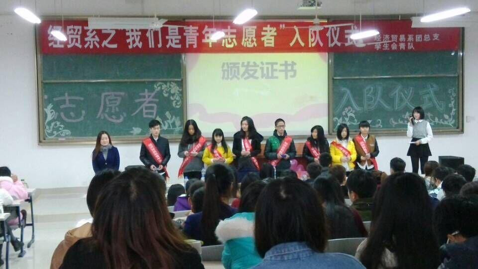 为了进一步弘扬“奉献、友爱、互助、进步”的志愿服务精神,引导和鼓励更多的团员青年积极参与志愿服务,深入推动志愿服务事业蓬勃发展。经济贸易系青年志愿者服务队于2014年 12月 23日在教学楼大阶二举办了志愿者入队仪式。