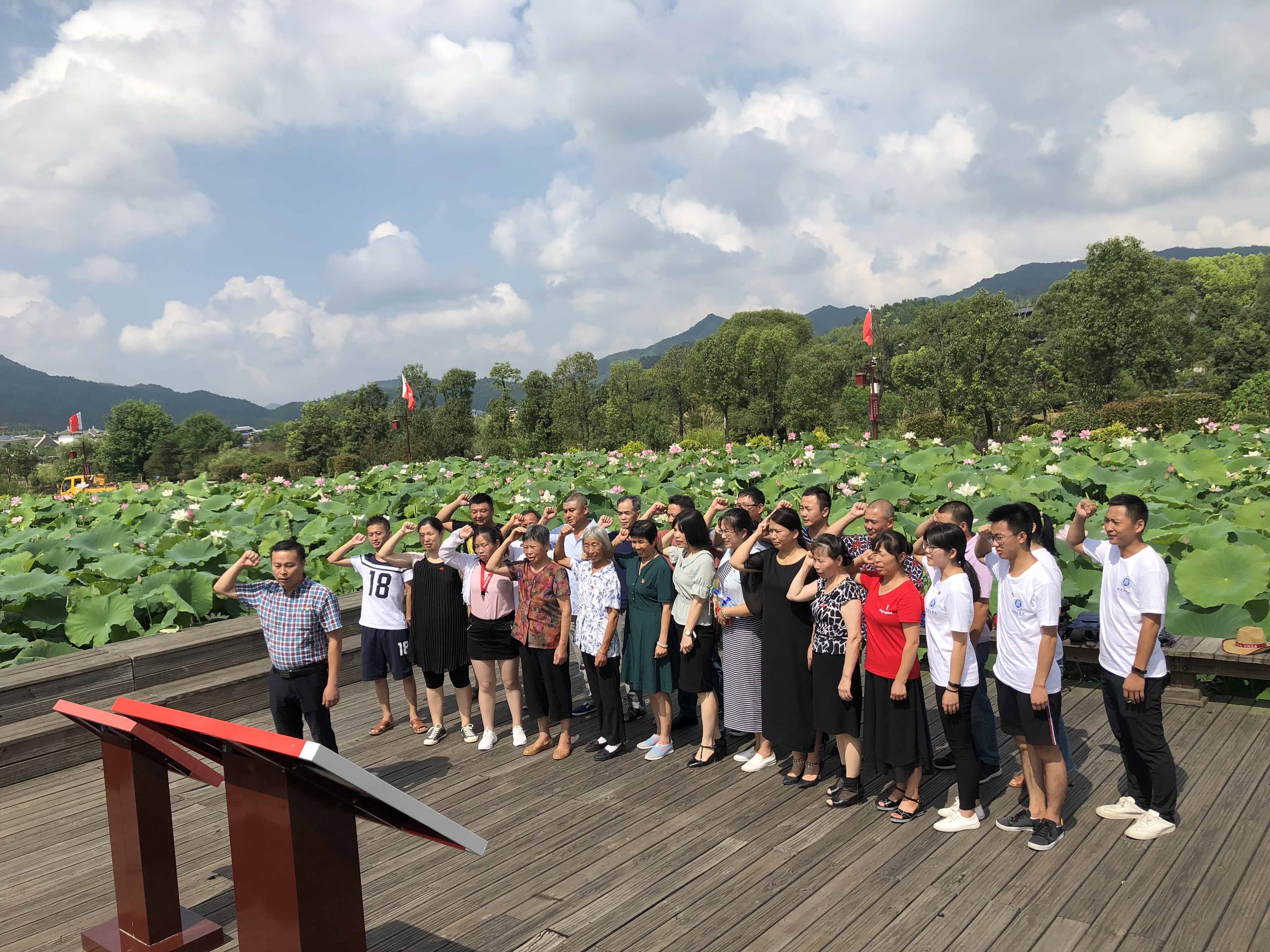 到达古田会址后,途经古田会议旧址外侧的大片池塘,一片片坚韧不拔的荷叶立在水中迎着炽热的太阳仍是生机勃勃,仿佛让我们看到了革命先辈那奋斗不息的身姿。站在池塘边一个专为合影制作的台子,在场的25位党员,在中都村第一书记张晓思的带领下,面向党旗庄严重温入党誓词。