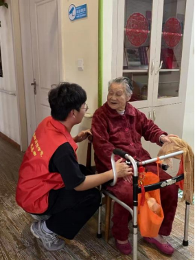 志愿者们围坐在老人身边,听爷爷奶奶讲过往故事。遇到视力不便的老人,大家拿起报纸念起新闻,把窗外的世界“读”给他们听。志愿者还帮助老人们整理衣物、打扫房间,搀扶老人在庭院散步,推着轮椅逛园区。