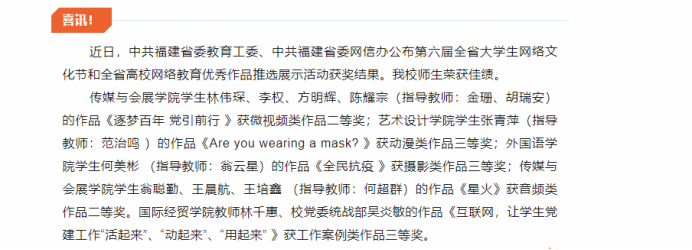 近日第六届全省大学生网络文化节和全省高校网络教育优秀作品推选展示活动评选结果揭晓,我院参赛作品《互联网,让学生党建工作“活起来”、“动起来”、“用起来” 》(主创:学院教师林千惠、校党委统战部吴炎敏)获工作案例类作品三等奖。