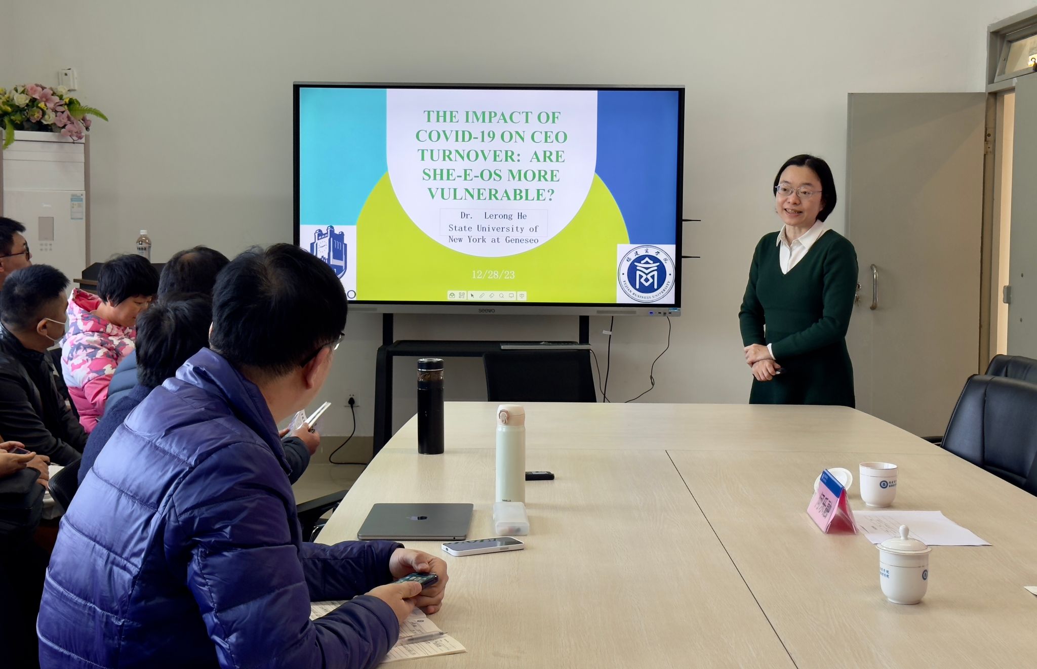 12月28日,美国纽约州立大学杰内索分校商学院院长何乐融教授应邀莅院讲学。yl7703永利集团院长张美涛、副院长林航以及专任教师参加了此次讲座。