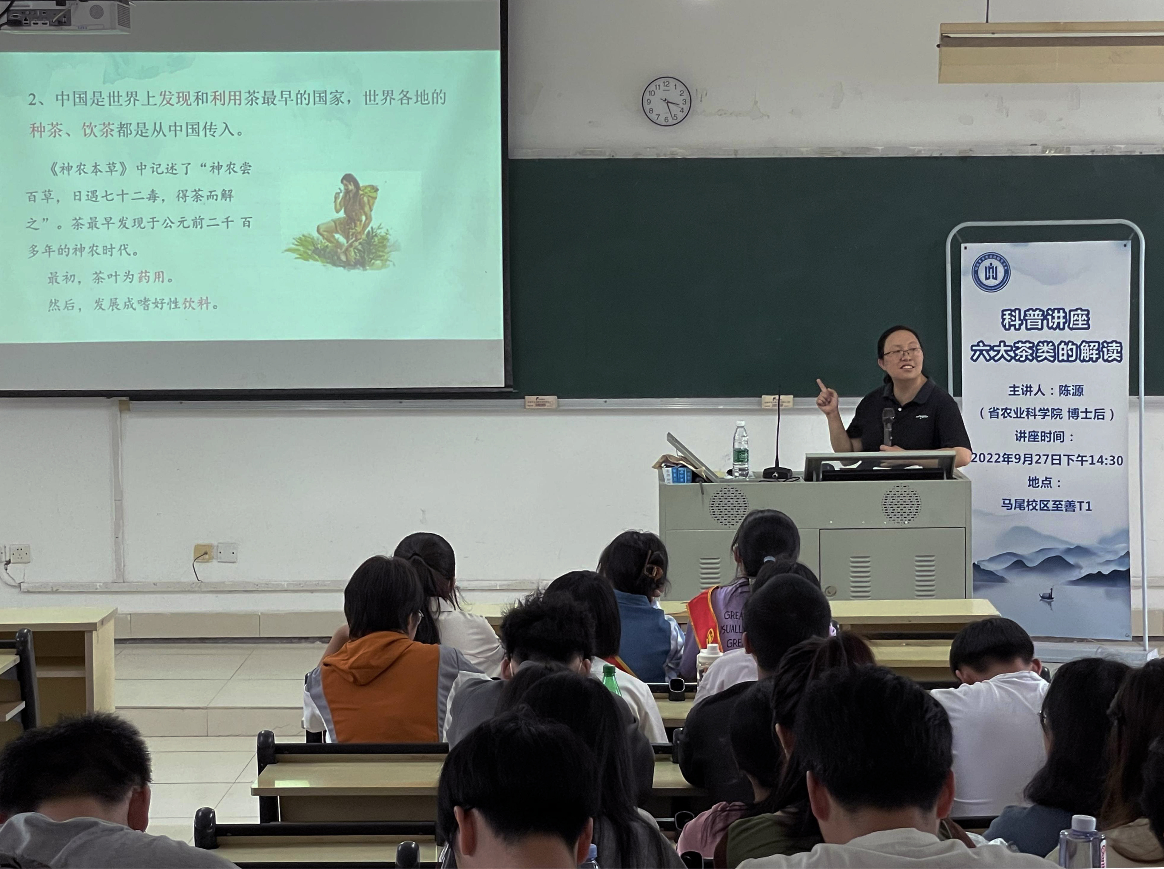 陈源副研究员用一张我国各类茶叶产量的变化图引出了本次讲座的主题——六大茶类的解读。她围绕茶叶的分类、各种茶类的历史演变与发展、茶叶分类的基础理论等五个方面展开演讲。讲解深入浅出、语言生动,给师生们带来了一场内涵丰富的科普盛宴。同学们听后都感到受益良多,将来可从各自专业的角度为福建茶文化传播和茶产业发展尽一份力。