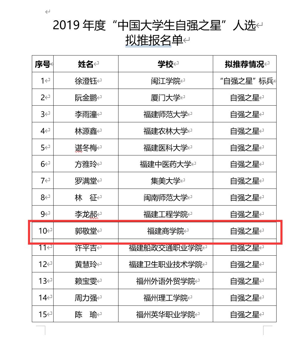近日,团省委推选出2019年度“中国大学生自强之星”推荐人选65名、 “福建省大学生自强之星” 100名。我院19级电子商务专业学生郭敬堂名列其中,被推选为2019年度“中国大学生自强之星”推荐人选,同时被评为2019年度“福建省大学生自强之星”。