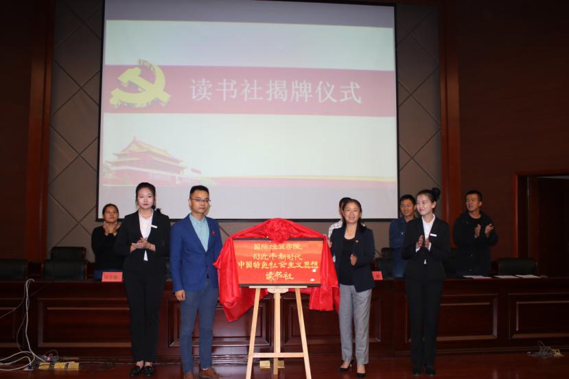 我院党委曹晓霞书记、党委许模春副书记为国际经贸学院“习近平新时代中国特色社会主义思想”读书社揭牌。