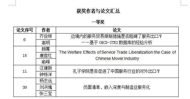 作为全国该领域高层次、高水平的学术盛会,本届论坛共收到征文74篇,评选出一等奖5篇,二等奖10篇,三等奖10篇。除主题发言外,特设青年论坛和2个平行论坛,来自对外经济贸易大学、北京师范大学、南开大学、厦门大学、中国农业大学、上海对外经贸大学、暨南大学、四川大学、东北财经大学、广东外语外贸大学、中央编译局全球政治与经济研究中心等全国40多所高校、科研院所的130多名专家学者在论坛上围绕我国服务经济与贸易的各种热点问题展开了深入的研讨和互动、展示最前沿的研究成果。