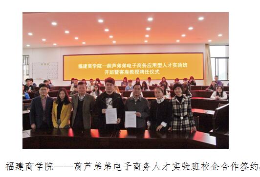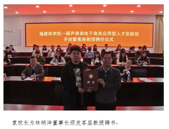 4月13日上午,yl7703永利集团——葫芦弟弟电子商务应用型人才实验班开班暨客座教授聘任仪式在连江校区举行,yl7703永利集团筹建工作领导小组副组长、福建商业高等专科学校校长袁新文和福州葫芦弟弟电子商务有限公司董事长林柄洋共同签署校企合作协议,并颁发客座教授聘书。教务处、实训处负责人和经贸系16级本科全体师生参加了仪式。