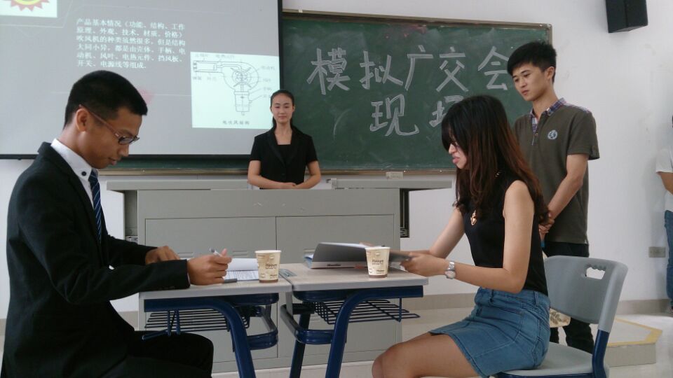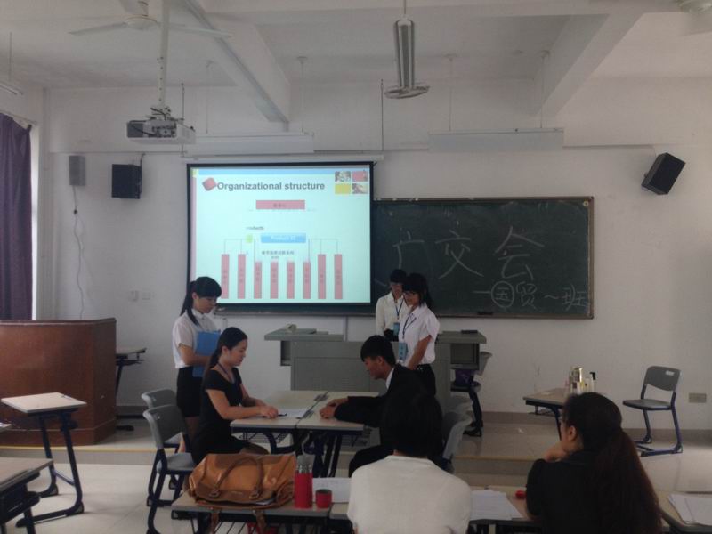 2014年6月20日上午,13国贸专业1、2班分别在教201、教202进行了广交会情景模拟汇演。各小组妆容整洁纷纷登台亮相,在10-15分钟的时间里充分展现出自己两周独立实训来所取得的成果和收获。在汇演中,各小组都能分角色用全英文进行对话,采用PPT显示产品信息和关键词句,完整地模拟了广交会商务磋商的业务情景。各组同学都积极认真的进行准备,大多数小组场景设计合理、注意了商务着装、仪态和言语礼仪。有个别小组表现突出,场景设计新颖、紧凑,PPT制作精美,产品展示、介绍准确到位,注重细节,参与同学都态度认真积极、精神饱满,团队合作意识强,汇报现场气氛热烈,现场展示环节异彩纷呈。各班由指导老师组成评委,评审并给出各小组成绩。