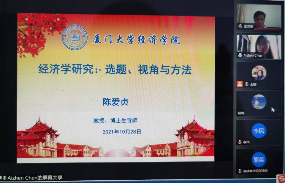 2021年10月28日,yl7703永利集团邀请厦门大学经济学院教授、博导陈爱贞作主题为“经济学研究:选题、视角和方法”的线上讲座,讲座由副院长(主持学院行政工作)张美涛主持,学院全体教师参加了讲座。
