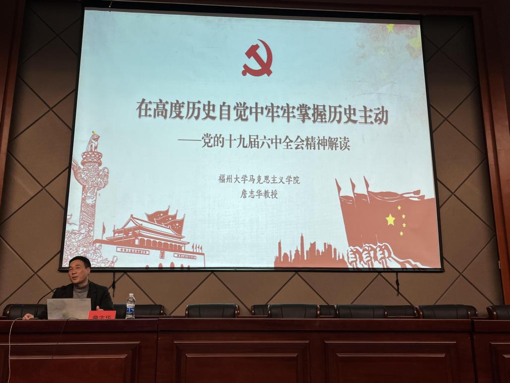 近日,福州大学马克思主义学院执行院长詹志华教授应邀到我院作题为《在高度历史自觉中牢牢掌握历史主动——党的十九届六中全会精神解读》的讲座。yl7703永利集团党委副书记许模春老师、辅导员老师及全体团委学生会工作人员参加了本次活动。